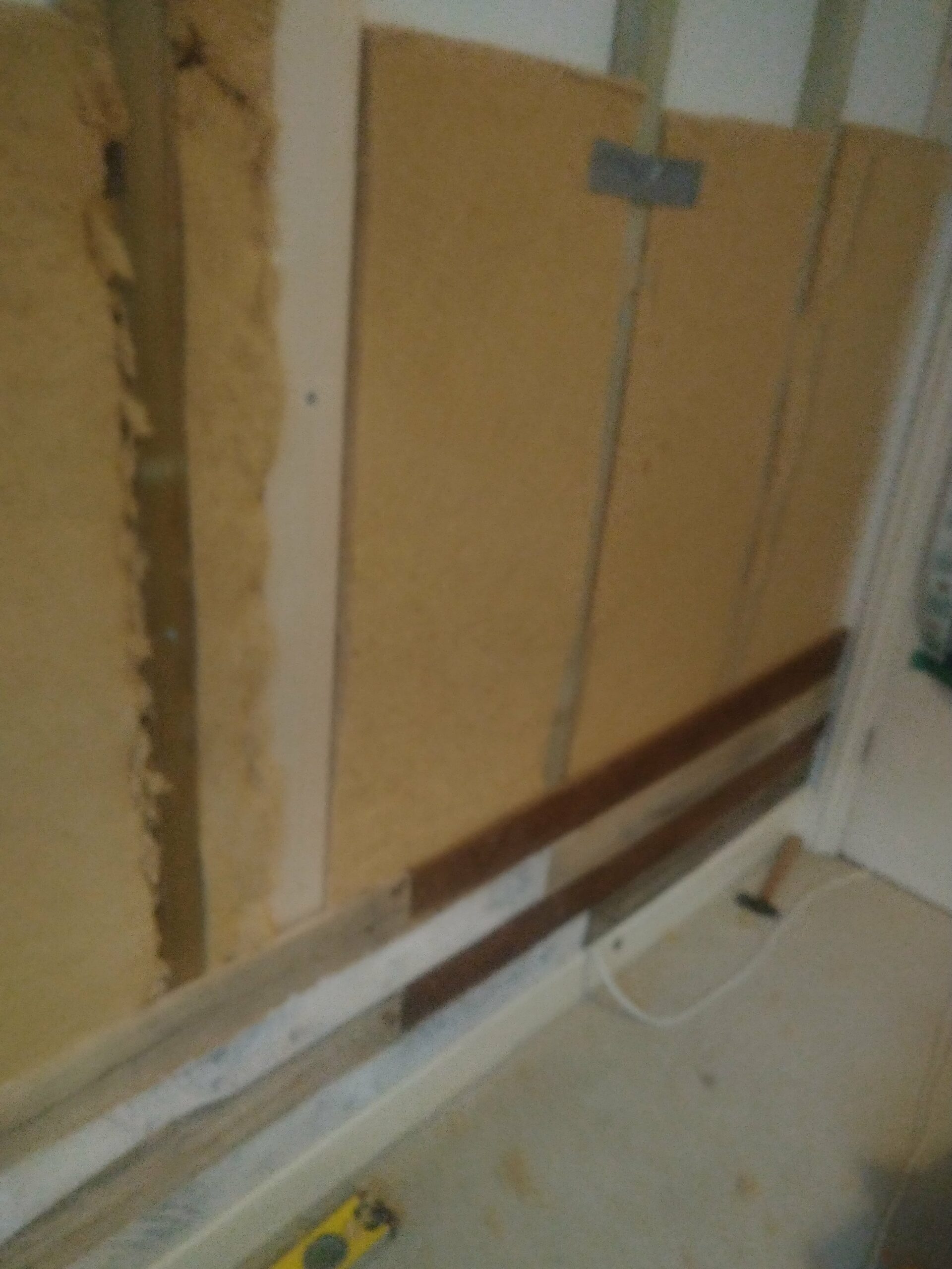 Next step was to get hold of some wood fibre insulation, not so easy for small quantities but thanks to https://phstore.co.uk/ for arranging it for me, delivery costs almost the same as the insulation in small quantities but cheaper than elsewhere and charming service too. I then fixed some 50mm battens to the wall at 600mm and push fitted the insulation between.