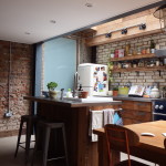 The project aimed to turn a cramped kitchen into a spacious area for cooking, eating and socialising. There is an industrial and sustainability theme to the project, the materials used are often from or designed for factories. Electrics are contained in galvanised metal conduit and the floor is concrete. Walls are exposed brick, both reclaimed glazed brick and the existing London stock bricks revealed to the world. The large glass panels to the roof draw in light to what was once a dark area and bring out the rich colours in the reclaimed wood cladding.